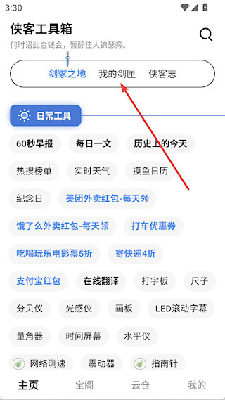 1、打开侠客工具箱,点击上方“我的剑匣”选项。