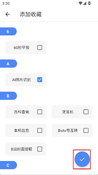 3、选择需要收藏的功能,点击蓝色按钮完成。