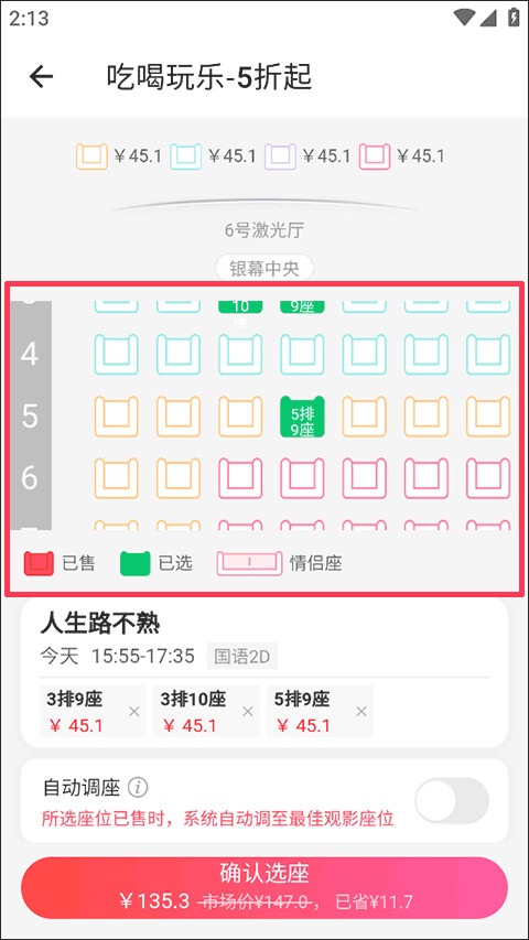 7、接下来,就可以在红色方框内的进行选座,选完座位就可以找到并点击“确认选座”的选项进行付款。