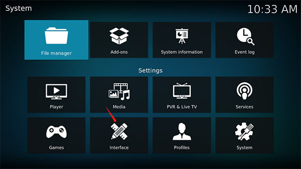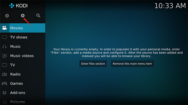 1、打开Kodi播放器,进入主界面后选择左上方中间的设置按钮。