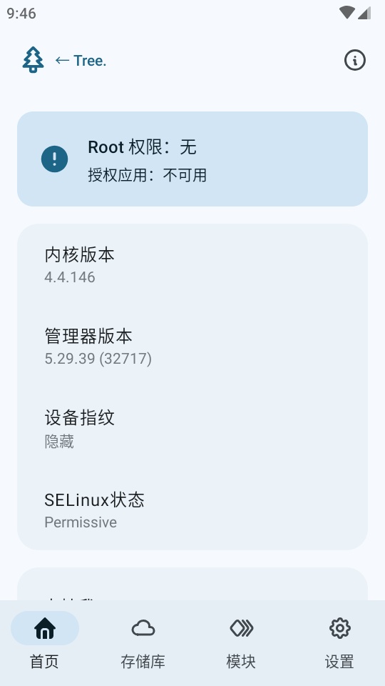 2、确认工作模式后在首页可查看手机内核版本、管理器版本、系统指纹等详细信息