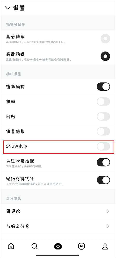 3、进入设置页面后,找到SNOW水印选项,将右侧开关关闭即可。