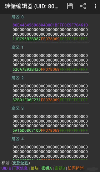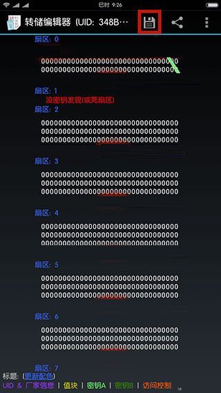 3、这时,可以看到卡片信息已经读取出来,可以点击右上方按钮将信息存储到本地,在读取过程中,可能因为卡片接触不良,导致某些扇区信息没有读取出来,可以再次读取来解决。所存储的文件可以通过主界面的编辑/分析转储文件功能来打开。