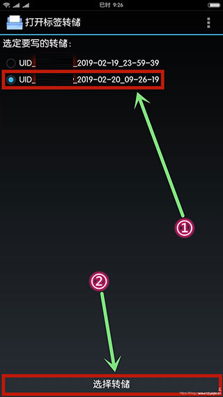 9、勾选刚刚保存的标签,选择后点击软件最下方“选择转储”进行下一步操作(须注意的是,此时需将CUID空白卡至于手机NFC感应区)。