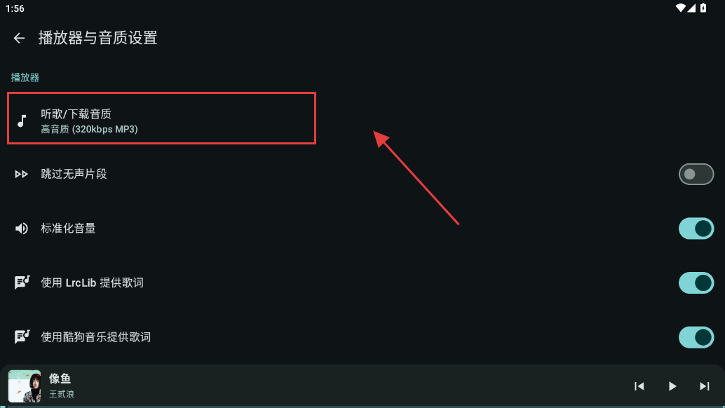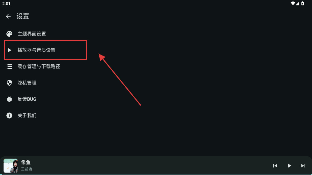 2、在设置选项中找到播放器与音质设置,点击进入音质相关配置页面。
