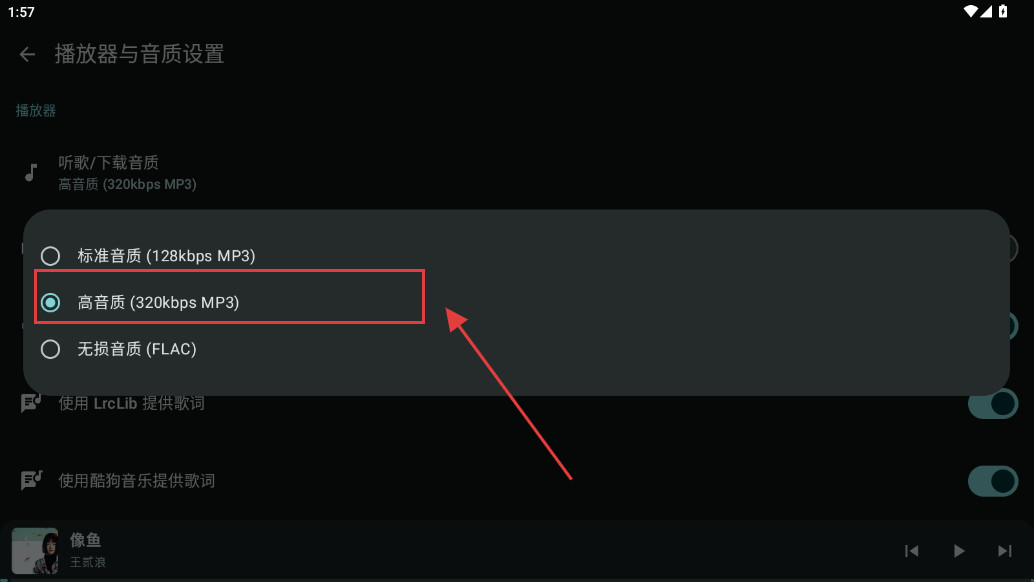 4、根据需求选择对应音质,软件支持标准MP3及无损FLAC等格式,默认多为高音质。