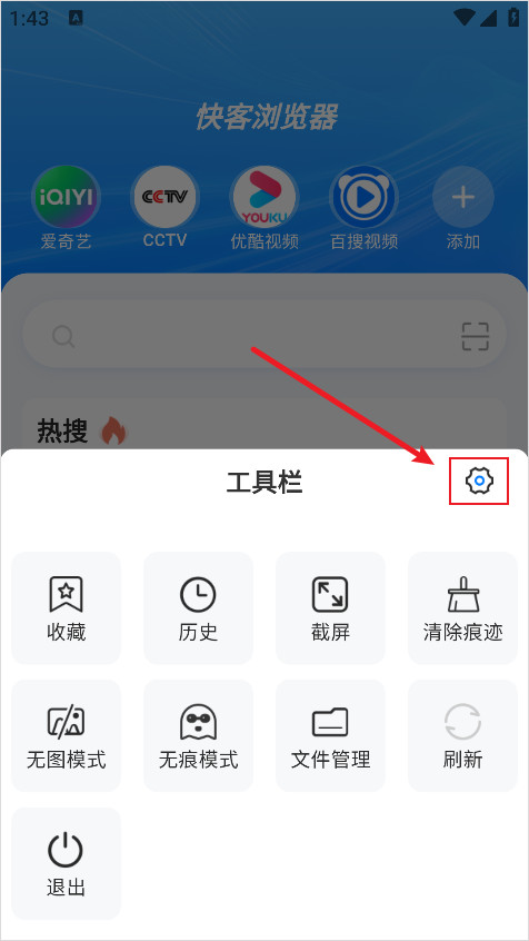 1、打开快客浏览器,在主界面点击位于导航栏的菜单选项。