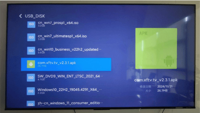 2、将下载好的小飞电视安装包的U盘插入到电视的USB接口上,会提示检测到新的USB设备打开。