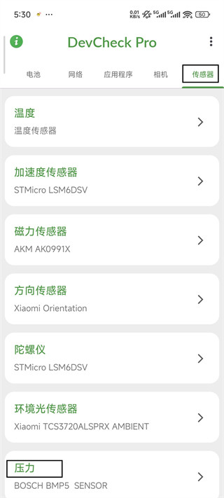 2、然后点击压力,这里的压力传感器就是气压计,一般正常状况下如下(数值不一定相同)。