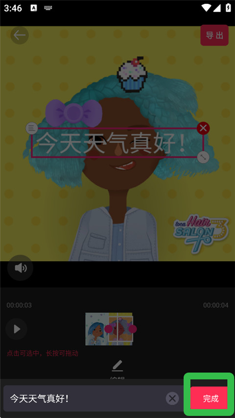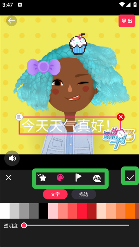 5、拖动字幕位置,并选择字体颜色、边框等,完成后点击√图标就可以啦。