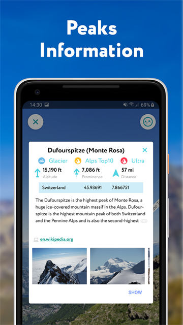 PeakVisor支持3D地形建模、实时山峰识别、离线地图加载及滑雪雪道规划,整合全球超百万座山峰数据,提供海拔、地形突起度、山脉归属等详细信息,集成GPS轨迹记录、照片地理标记及飞行视角动画生成功能。通过手机摄像头实时识别周边山峰并叠加3D名称标签,包含山峰、山脊、垭口、观景台等200多种地形特征。