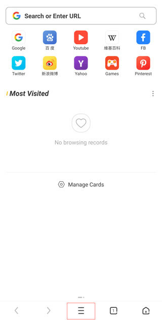 1、打开UC浏览器国际版,点击应用底部的菜单按钮;