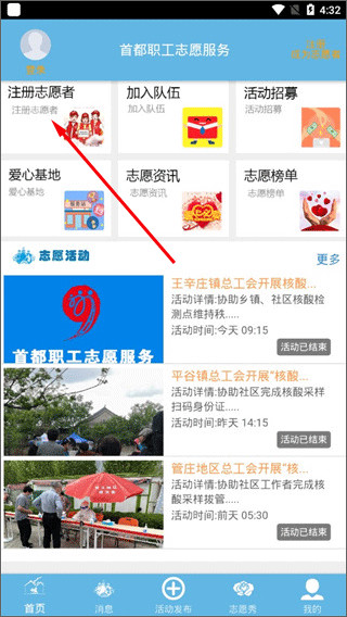 2、在首页可以看到志愿活动,以及志愿资讯、爱心基地等服务,点击“注册志愿者”;