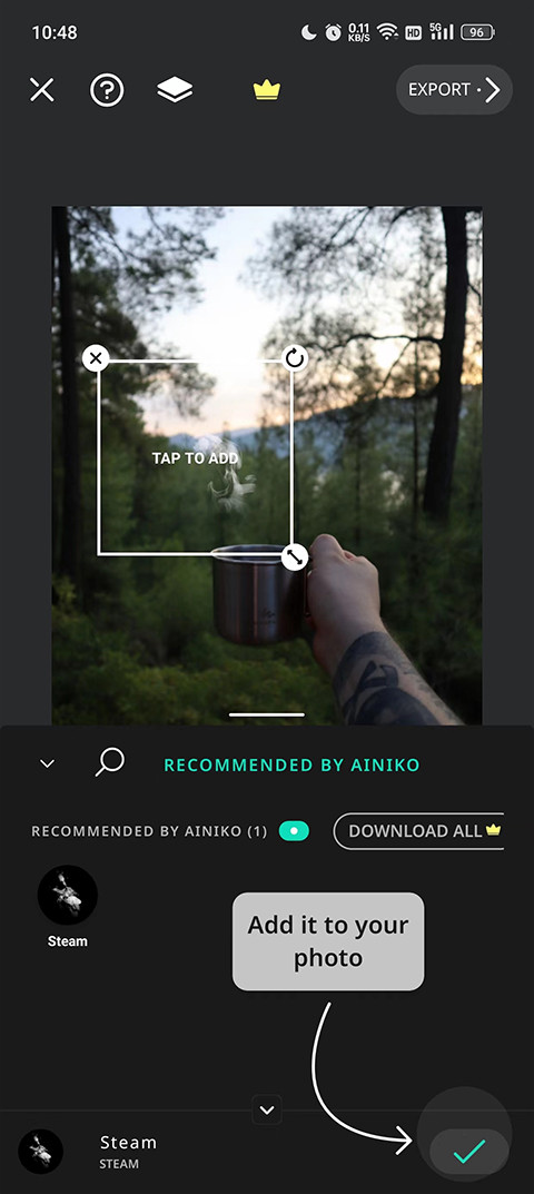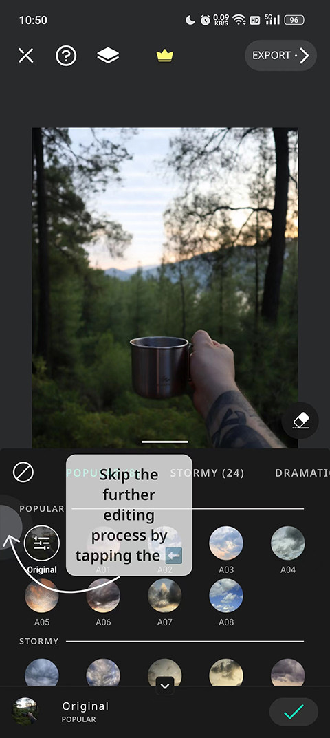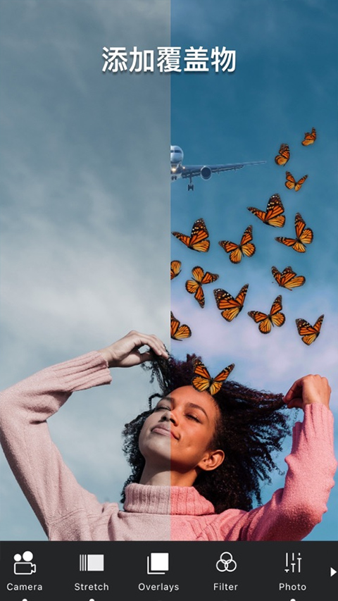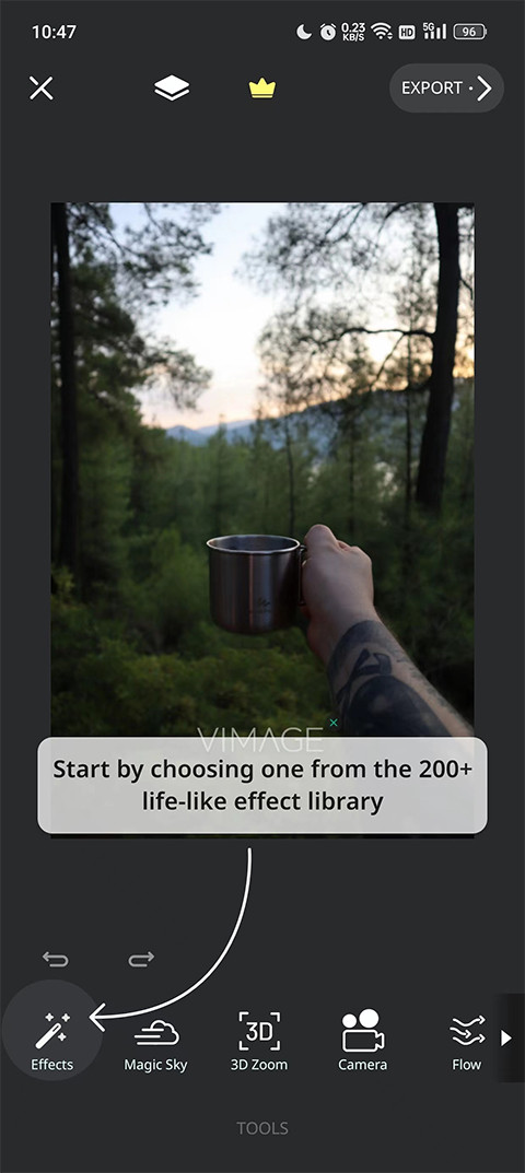 1、打开VIMAGE并按下“+”按钮从你的图库或我们的库存中选择一个。在添加效果之前,请随意编辑照片。