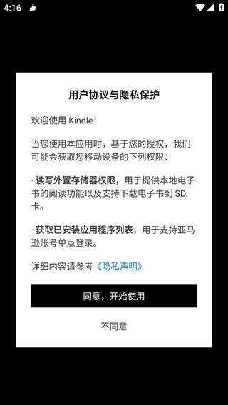 1、打开kindle阅读器,需要选择“同意,开始使用”即可进入应用。