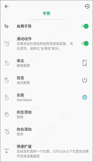 4、然后就可以根据你自己的需要进行手势设置:关闭屏幕、开启应用、开启快捷方式、屏幕截图、分屏、关机对话框、返回、主屏幕菜单、手电筒、切换自动旋转屏幕、展开通知、展开快速设置等等!