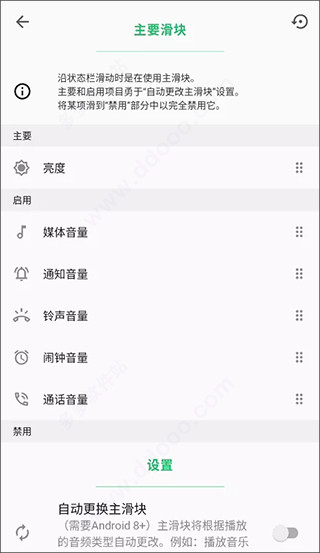 6、打开滑动动作滑块,沿屏幕左右滑动可以调节亮度。当然你也可以调节音量!如果启用了 自动更换主滑块 ,常规情况下是调节亮度,播放音乐时就可以自动切换为调节音量!非常炫酷!
