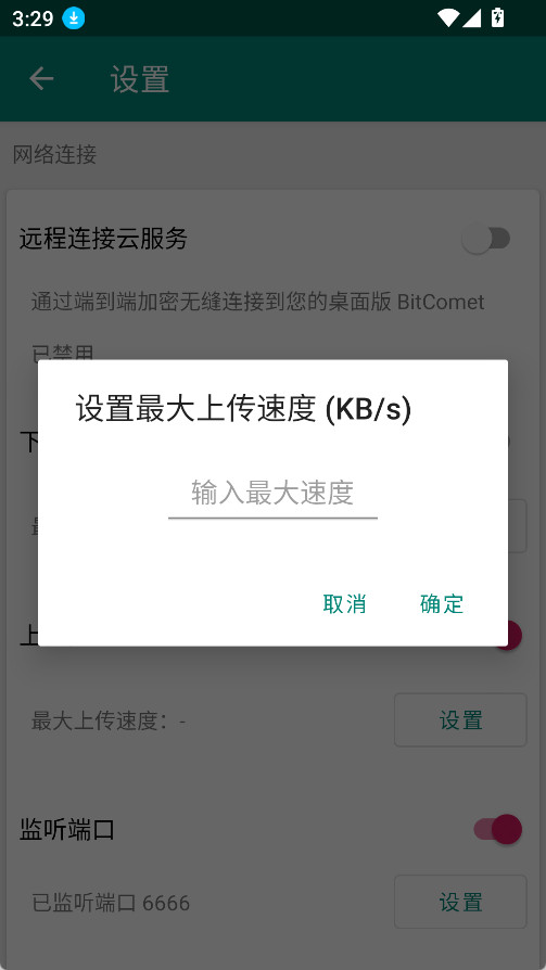 4、在弹出的设置最大上传速度页面中,输入您想要的最大上传速度,最后点击“确定”按钮即可。