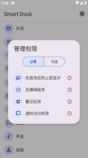 在管理权限界面,按提示开启“在其他应用上层显示”“无障碍服务”“最近应用”“通知访问权限”等必需权限,确保功能正常运行。