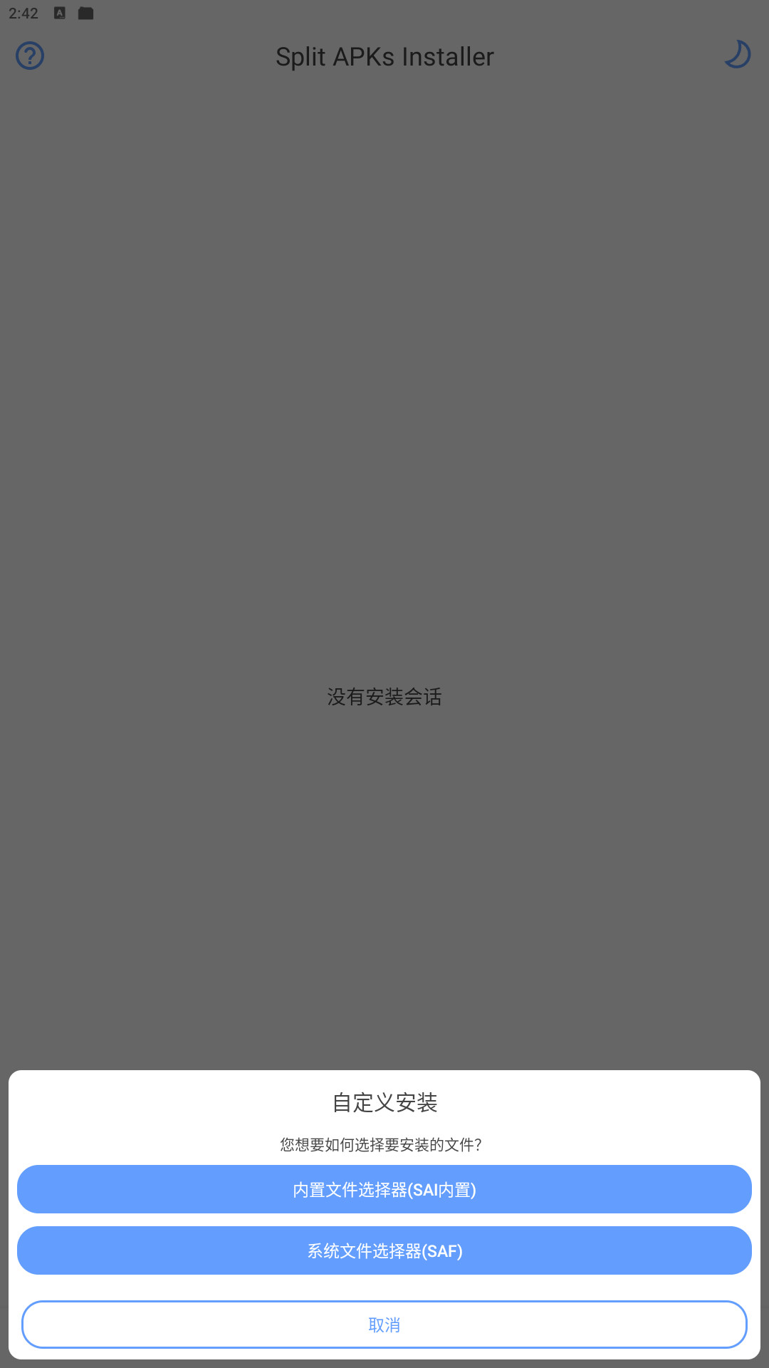 5、弹出安装提示,包括内置文件选择器(SAI内置)和系统文件选择器(SAF),用户可根据需求选择使用,这里以系统文件选择器(SAF)为例,