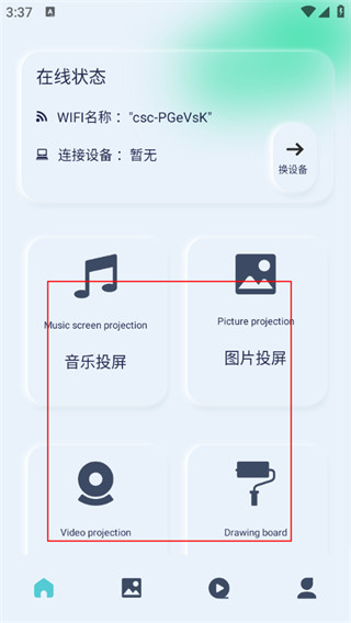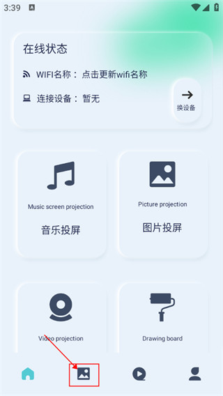 1、在首页共有音乐投屏、图片投屏、视频投屏三种投屏方式,投屏首先就要链接上硬件设备