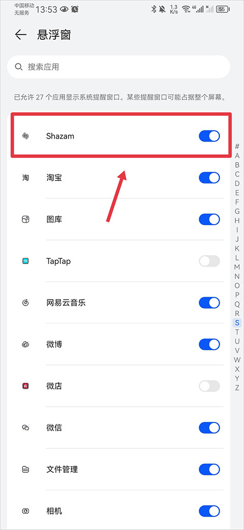 2、然后点击进入后找到Shazam,并将悬浮窗功能开启