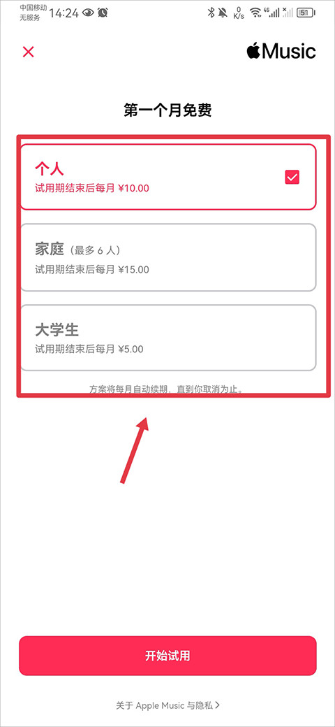 3、然后选择你要领取的套餐,分为个人、家庭、大学生三种,选择后并完成登录或注册即可获得一个月的会员