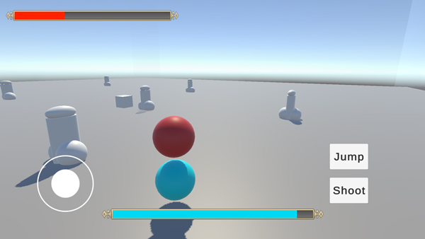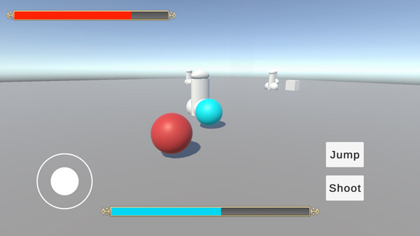 移动控制:滑动屏幕左侧虚拟摇杆调整方向,点击【Jump】跳跃过障碍,【Shoot】发射能量波。