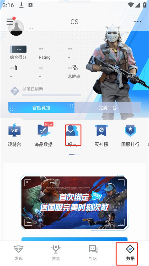 1、进入完美世界电竞后,点击数据在数据页面选择好友;