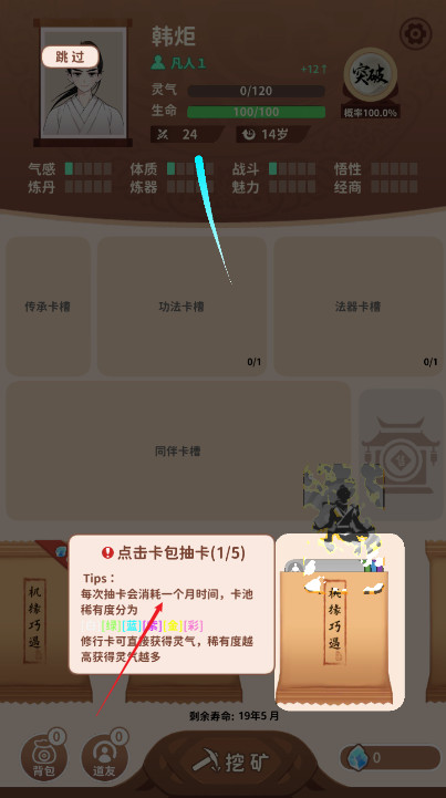1、优先抽取基础功法卡,稳固灵根属性,提升修炼效率与灵气储备。