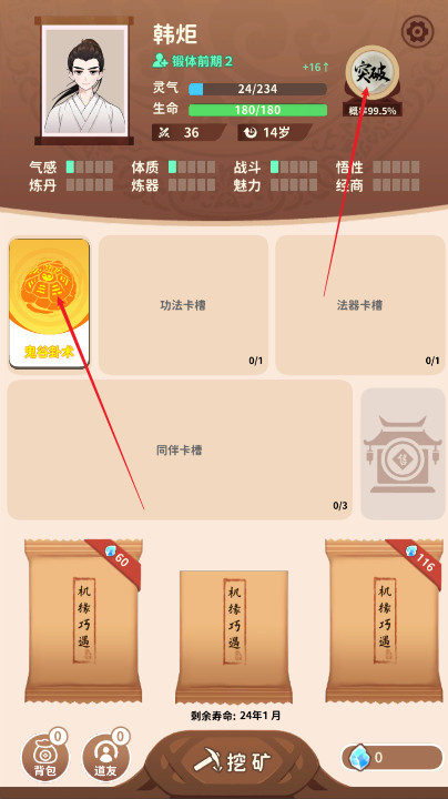 不用开卡包,直接开始挖矿,直到你的灵石有个几千的,刷宝阁盛会,前期找锻体神术接着就是一直刷,突破概率不够就买突破丹[优化:大恢复术(可用恢复术代替)+枯木逢春可以弥补休眠时的空白期]。