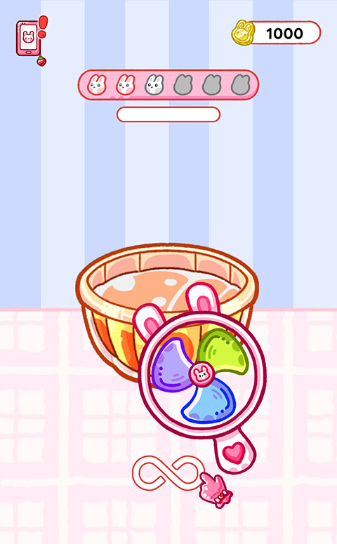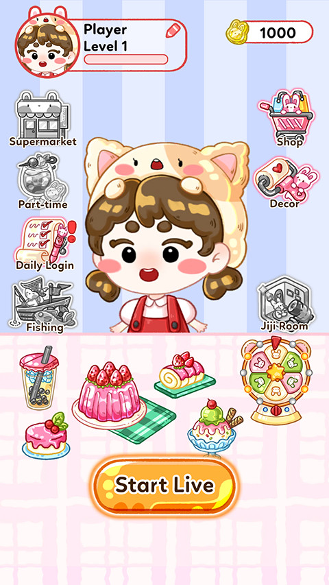 4、萌趣卡通画风:采用色彩鲜艳的卡通风格,主角吉吉设计为夸张的大头形象,搭配动物造型帽子、闪烁甜品等可爱元素。满屏粉色特效和精致装饰营造出梦幻氛围,尤其吸引低龄女性玩家。