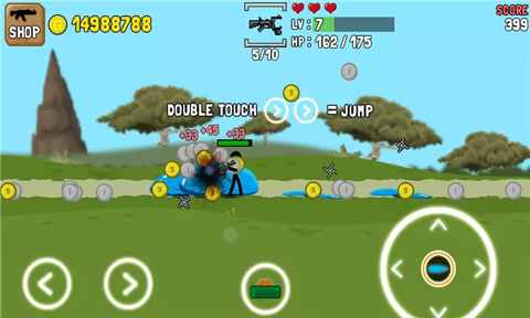 1、触摸屏幕或使用虚拟操纵杆移动和跳跃射击;