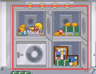 来到银行二楼,打开保险柜,根据图形找到钻石,红心,星星以及贝壳并依次放入,保险柜就会打开,里边有很多宝物。