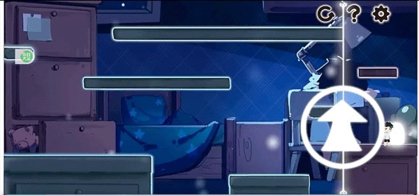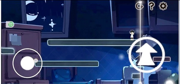 4、屏幕左侧控制人物移动,右边的箭头控制人物跳跃,发光的线可以控制空间的变化