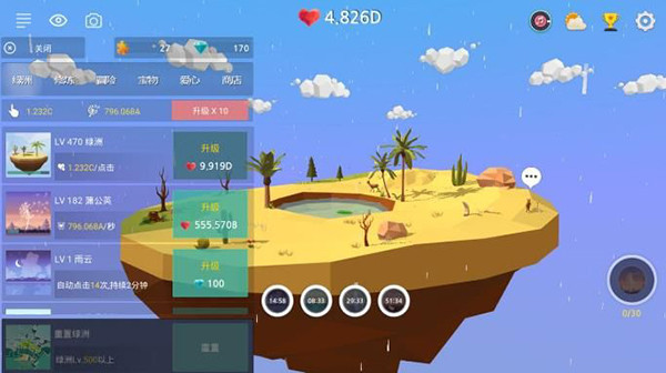 点击:您可以点击屏幕收集爱心,并用它来升级绿洲的景观、植物和动物。