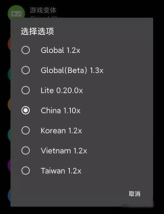 注意”游戏变体“很重要,如果你要玩和平精英就要选择”China 1.10x",国际版的话就选"Global 1.2x"。