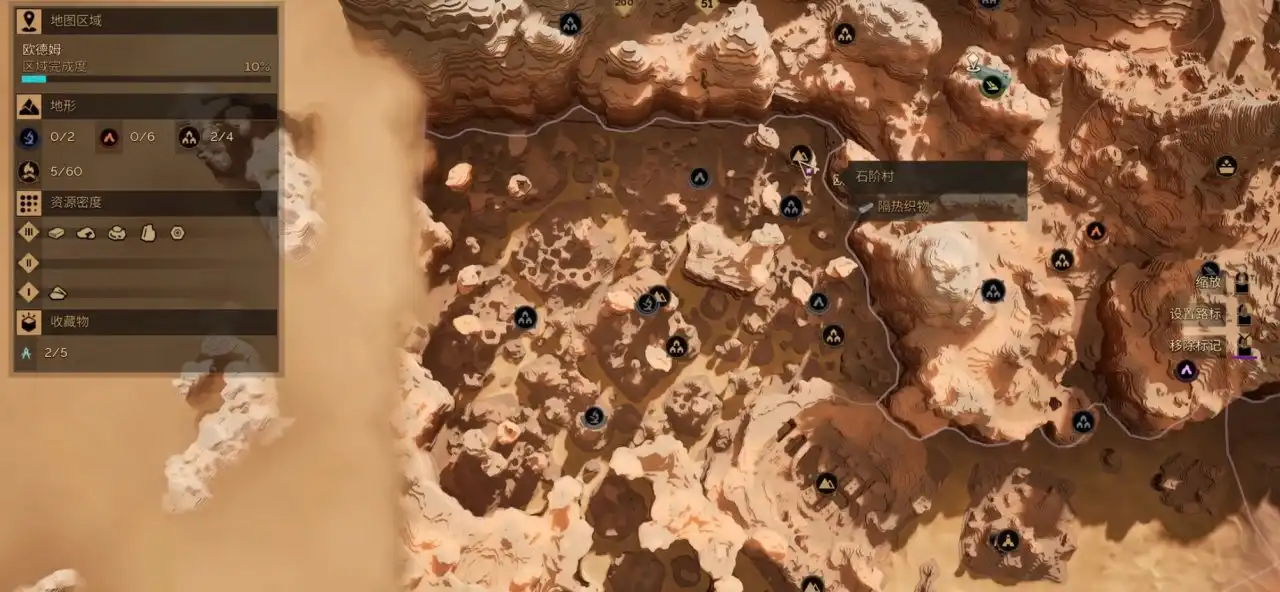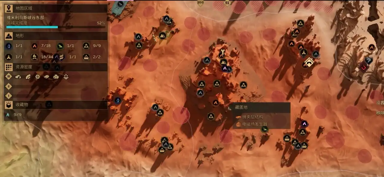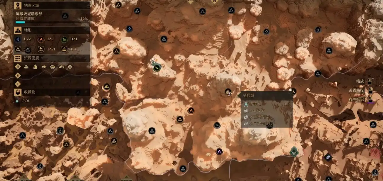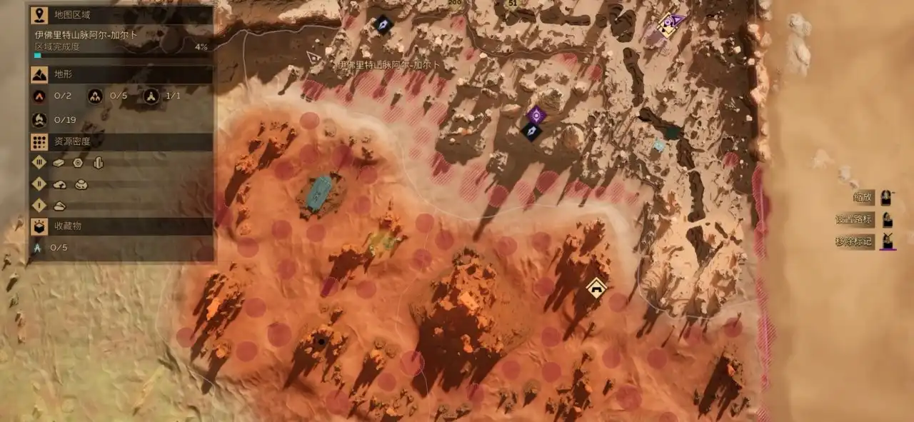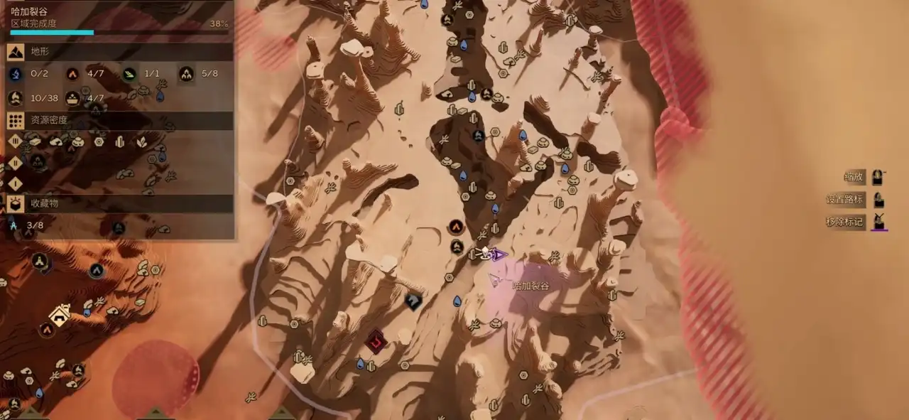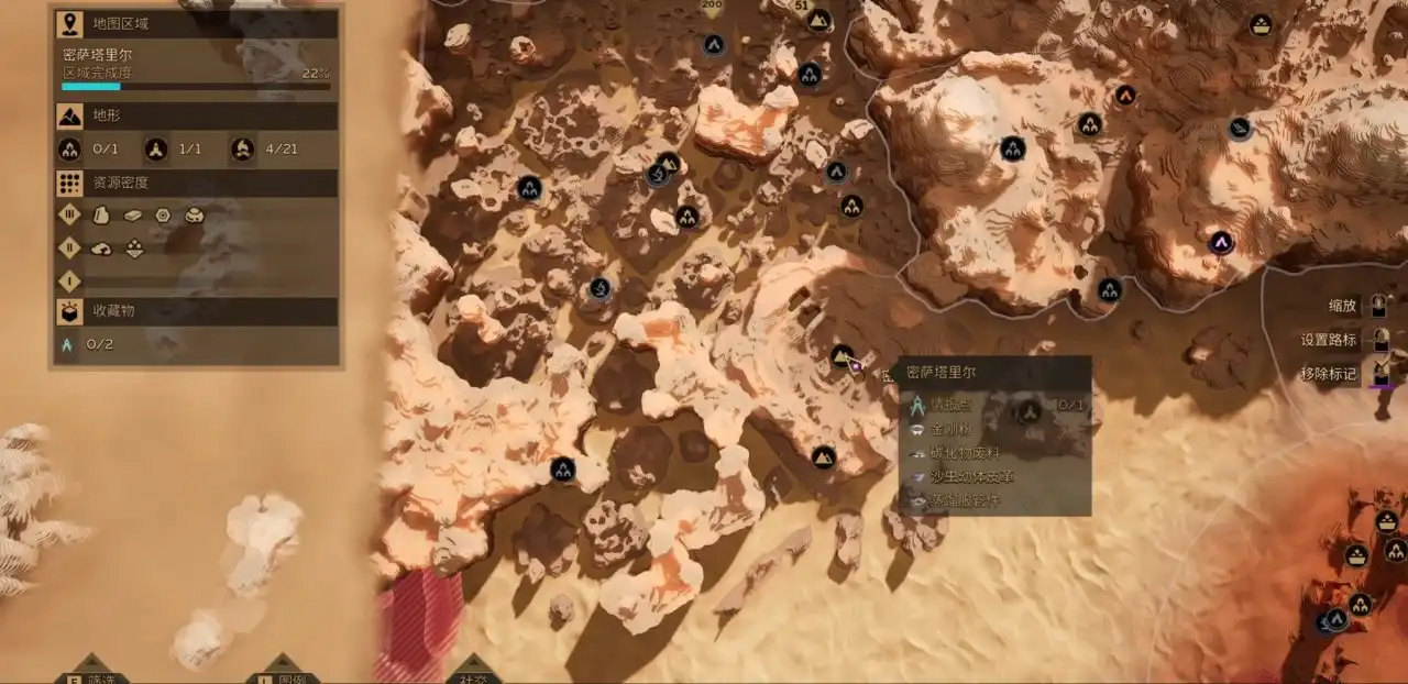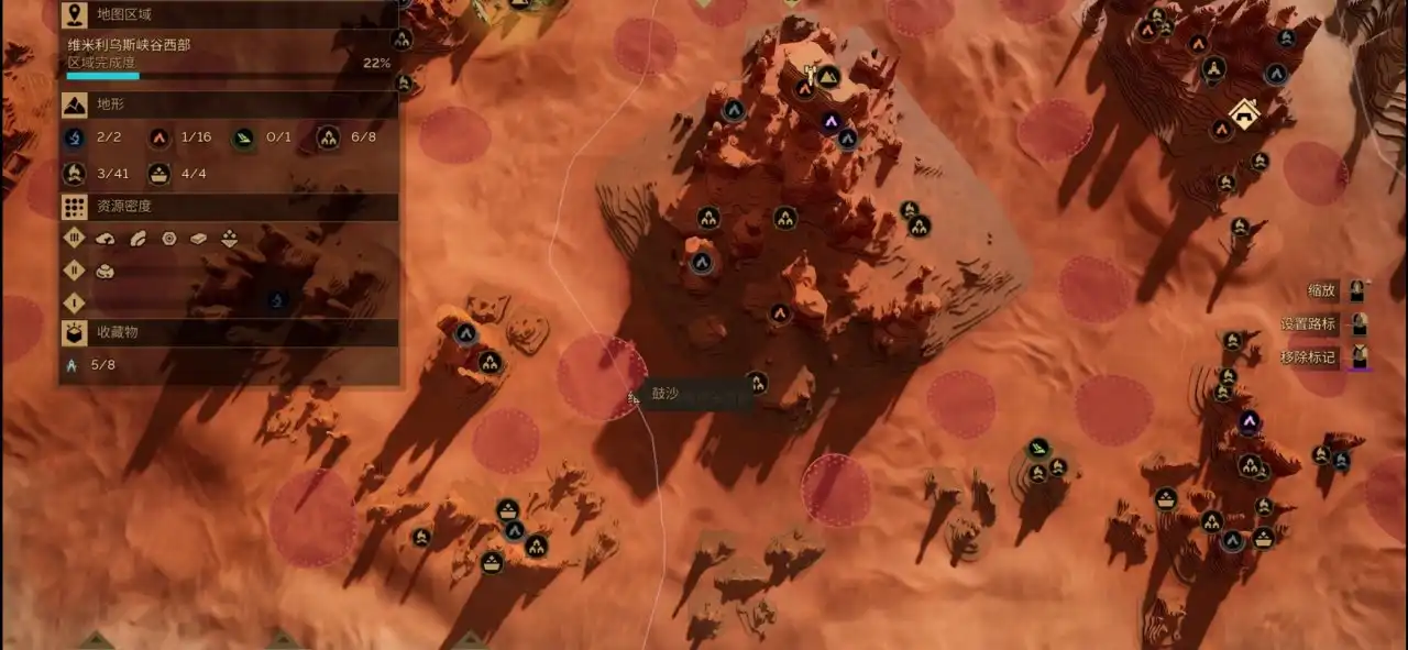 在地图上显示的红色的圈里面带点的是鼓沙,在鼓沙里我们能收集到面粉沙,走在鼓沙上面会发出声响吸引沙虫