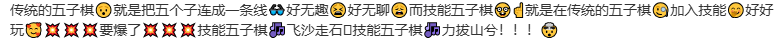 源于近期热播综艺《喜人奇妙夜2》中演员张兴朝、李嘉诚的抽象喜剧《技能五子棋》,通过无厘头梦到哪句说哪句的表演风格用飞沙走石、力拔山兮等中二技能打破传统五子棋玩法。传达快乐兴趣、快乐教育。