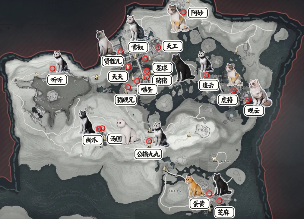 燕云十六生不见山中的猫戏分布在千年渡、墨城旧址、绝嶂岭、碧水云涛、墨城这几个区域角落中。在地点中找到猫猫即可互动完成对应的猫戏。下文列举各个猫戏的分布位置区域角落地点!