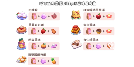 Hello Kitty冒险小岛中的美食分别需要使用烤箱、浓缩咖啡机、甜品机、汽水机、披萨烤箱、糖果云机、蛋锅小站、奇想咖啡馆等方式来制作,各个不同的机器所制作出的是我也不相同,下文介绍具体的各个美食的制作配方方式内容!