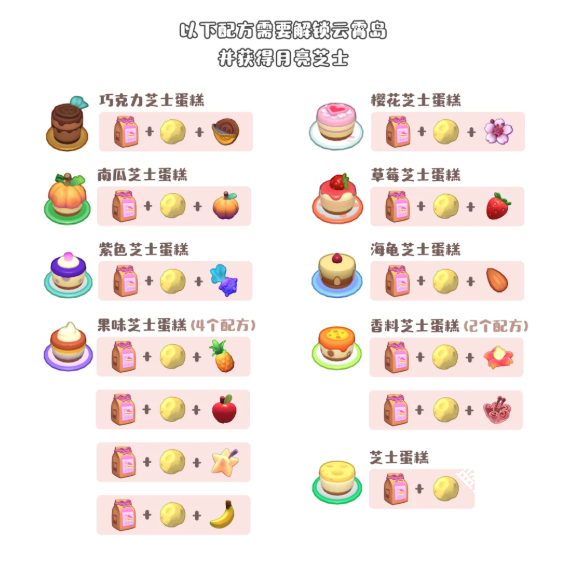 巧克力芝士蛋糕、樱花芝士蛋糕、南瓜芝士蛋糕、草莓芝士蛋糕、紫色芝士蛋糕、海龟芝土蛋糕、果味芝士蛋糕(4个配方)、香料芝士蛋糕2个配方)
