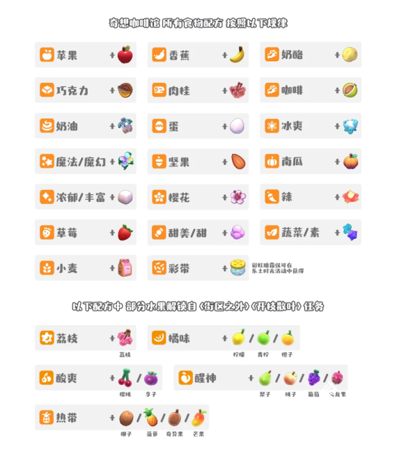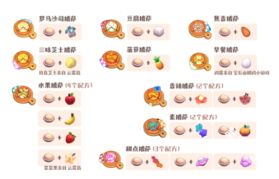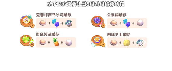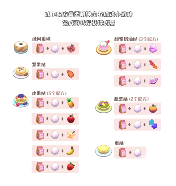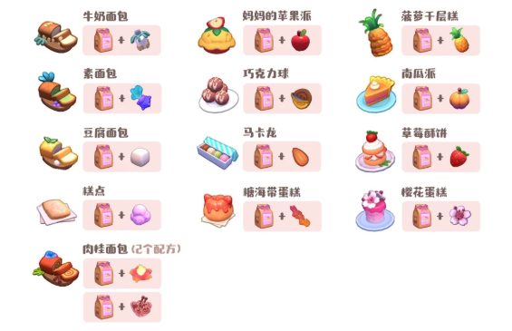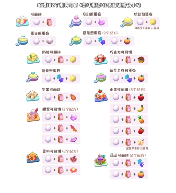 可丽饼、奇幻煎蛋卷、松软煎蛋卷、蛋白煎蛋卷、蔬菜煎蛋卷(2个配方)、奶酪可丽饼、巧克力可丽饼、营养煎蛋卷、蔬菜至尊煎蛋卷、坚果可丽饼、水果可丽饼(5个配方)、甜蜜可丽饼(3个配方)、香料可丽饼(2个配方)、星星果来自云霄岛、蔬菜可丽饼(2个配方)