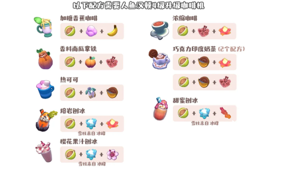 加糖香蕉咖啡、浓缩咖啡、香料南瓜拿铁、巧克力印度奶茶(2个配方)、热可可、甜蜜刨冰、熔岩刨冰、樱花果汁刨冰
