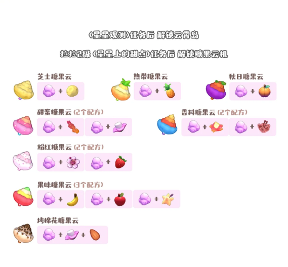 芝土糖果云、热带糖果云、秋日糖果云、甜蜜糖果云(2个配方)、香料糖果云(2个配方)、粉红糖果云(2个配方)、果味糖果云(3个配方)、烤棉花糖果云