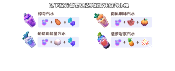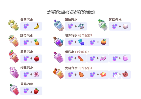 香蕉汽水、奶油汽水、笑话汽水、热带汽水、沼泽汽水(2个配方)、苹果汽水、甜汽水(3个配方)、樱花汽水、火焰汽水(3个配方)、草莓汽水