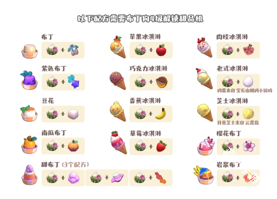 布丁、苹果冰淇淋、肉桂冰淇淋、紫色布丁、巧克力冰淇淋、老式冰淇淋、豆花、香蕉冰淇淋、芝土冰淇淋、南瓜布丁、草莓冰淇淋、樱花布丁、甜布丁(3个配方)、岩浆布丁