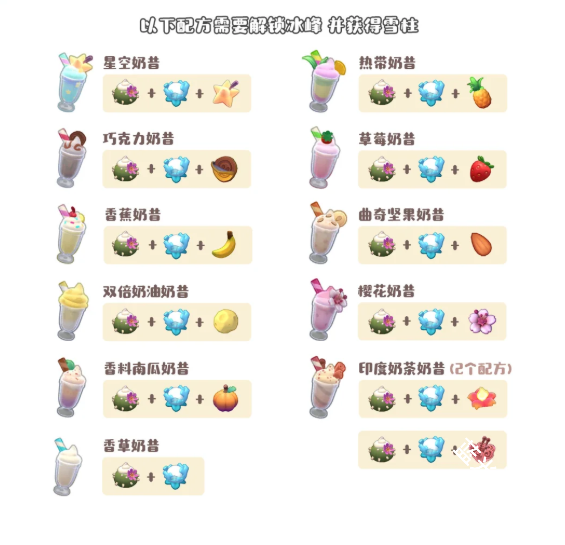 星空奶昔、热带奶昔、巧克力奶昔、草莓奶昔、香蕉奶昔、曲奇坚果奶昔、双倍奶油奶昔、樱花奶昔、香料南瓜奶昔、印度奶茶奶昔(2个配方)、香草奶昔