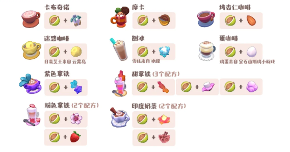 卡布奇诺、摩卡、烤杏仁咖啡、迷惑咖啡、刨冰、蛋咖啡、紫色拿铁、甜拿铁(3个配方)、粉色拿铁(2个配方)、印度奶茶(2个配方)