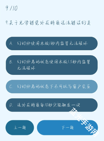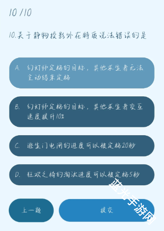 10、吴于静物投影外在特质说法错误的是?幻们灯师定格的目标,其他求生者无法主动结束定格